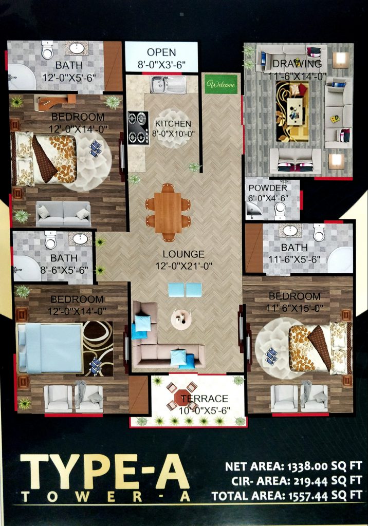 Skillfully designed on a total cover area of 1557.44 square feet, the apartment offers generous space for 3 bedrooms with attached baths, a drawing room with a powder room, a kitchen, a lounge, and a balcony. The modern-style apartment radiate experience of magnificence, comfort, and style for everyone.