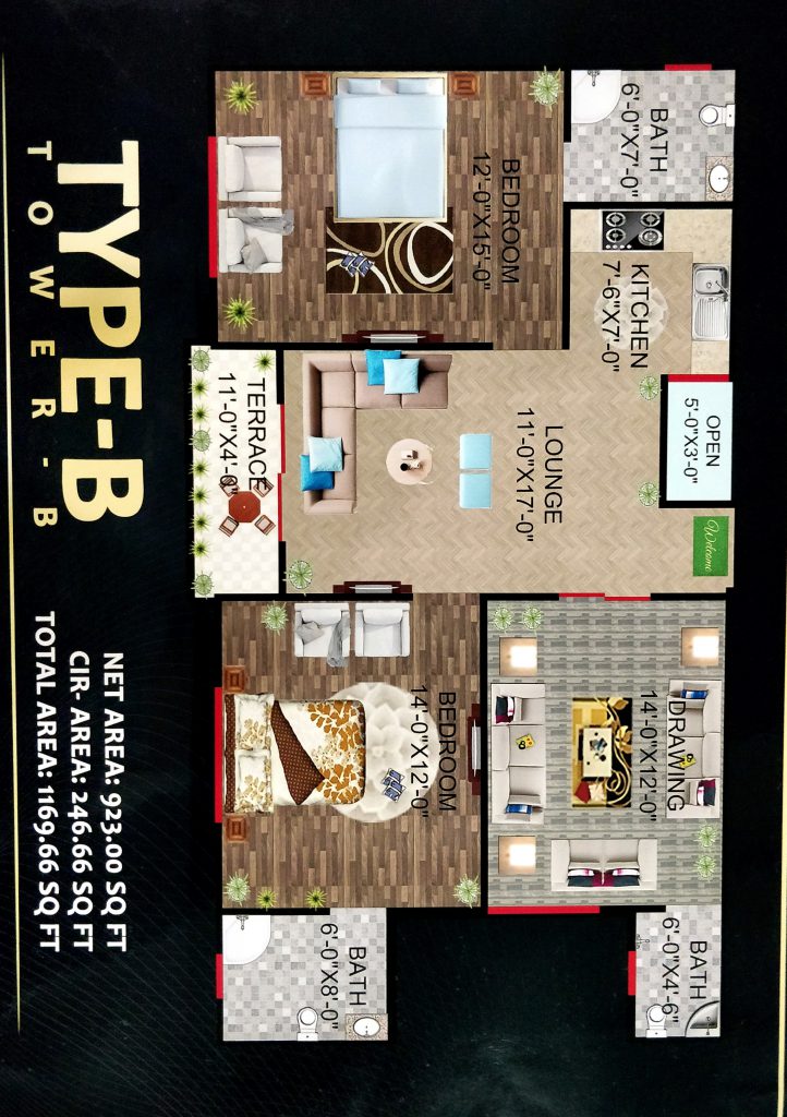 Using a total covered area of 1169.66 square feet, the Type B apartment at Shayan Garden Square offers 2 bedrooms with an attached bath, a drawing with an attached bath, a spacious lounge, open style kitchen, and a wide terrace. The mid-ranged apartment is a perfect living space for a nuclear family or investment purposes.