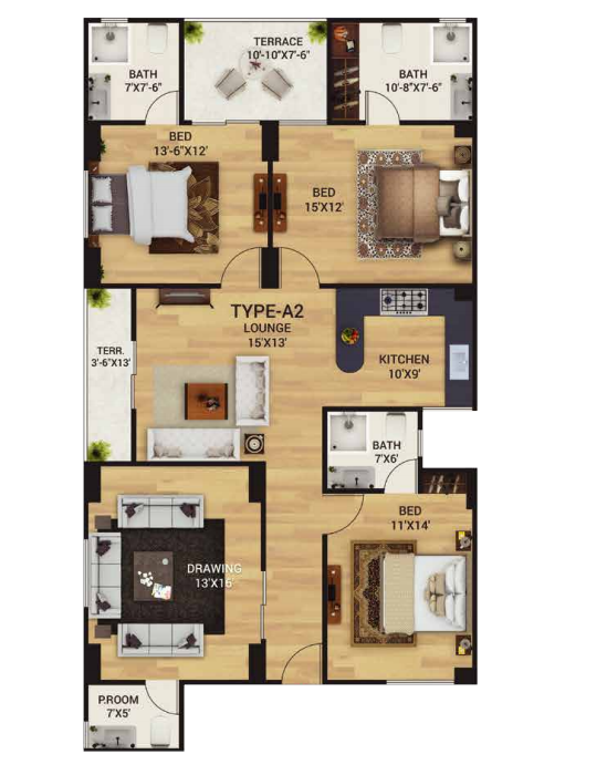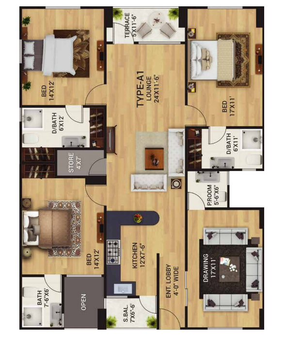 Type A-1 apartment is also a 5 room apartment, similar to the Type A category. It is more of an inverted copy of the type A design. It consists of 3  super spacious bedrooms with attached bathrooms, kitchen, lounge, drawing room with a powder room, a store and a terrace. It is also equipped with a small balcony to add enhanced charm to your residency.