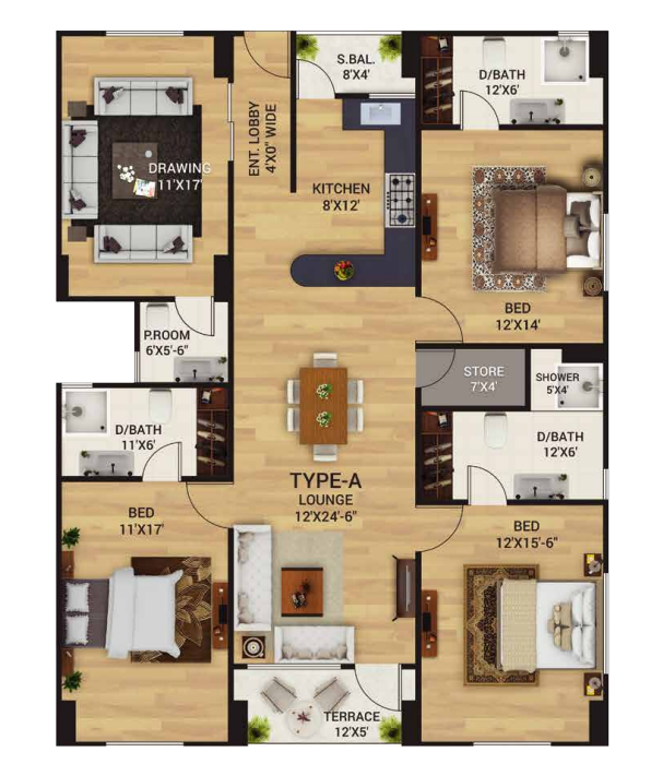 Type A apartment consists of 5 rooms designed to contribute to customer’s comfort and luxury. The apartment comprise of three super spacious bedrooms with attached bathrooms, kitchen, lounge, drawing room with a powder room, a store and a terrace. It is also equipped with a small balcony to add enhanced charm to your residency.