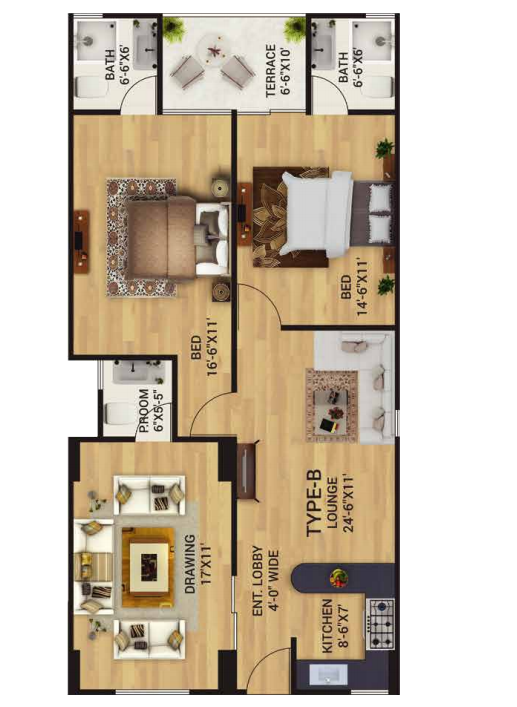 Type B apartment is a four-room apartment. It is designed to furnish the needs of a small family. It consists of 2 bedrooms with attached bathrooms, a drawing room with powder room, a lounge and an expansive terrace.