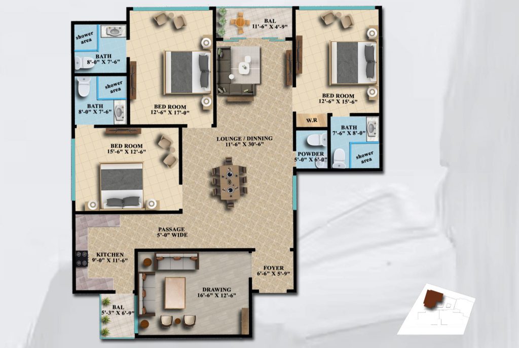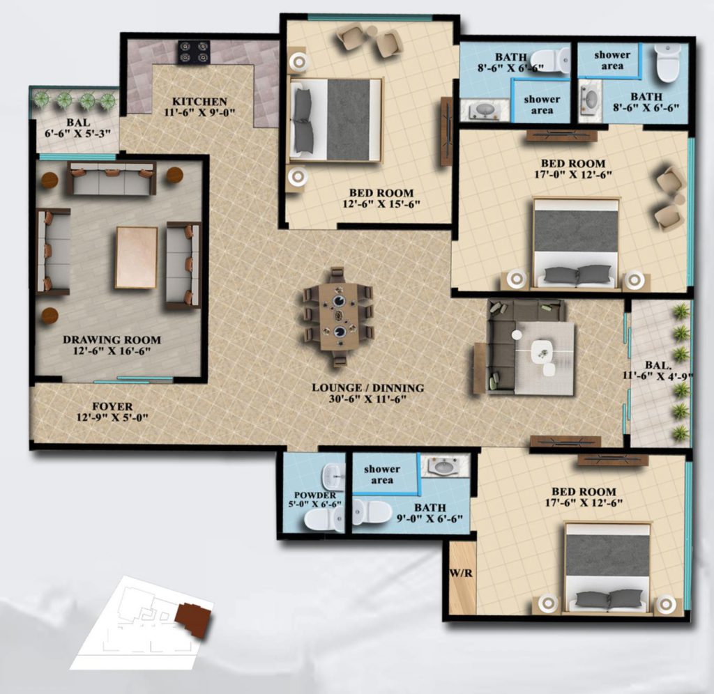 At Shayan Iconic Pearl, the builders offer 6 and 5-room luxury apartments in 4 categories with reserved parking. Each apartment has bedrooms with an attached washroom, lounge, drawing room, stylish kitchen, a terrace, and a dedicated parking slot in the parking area. Except for the parking floors, that is, floors 1 to 5, each floor has 4 apartments following the same design. The covered area and design of each category are variable.
