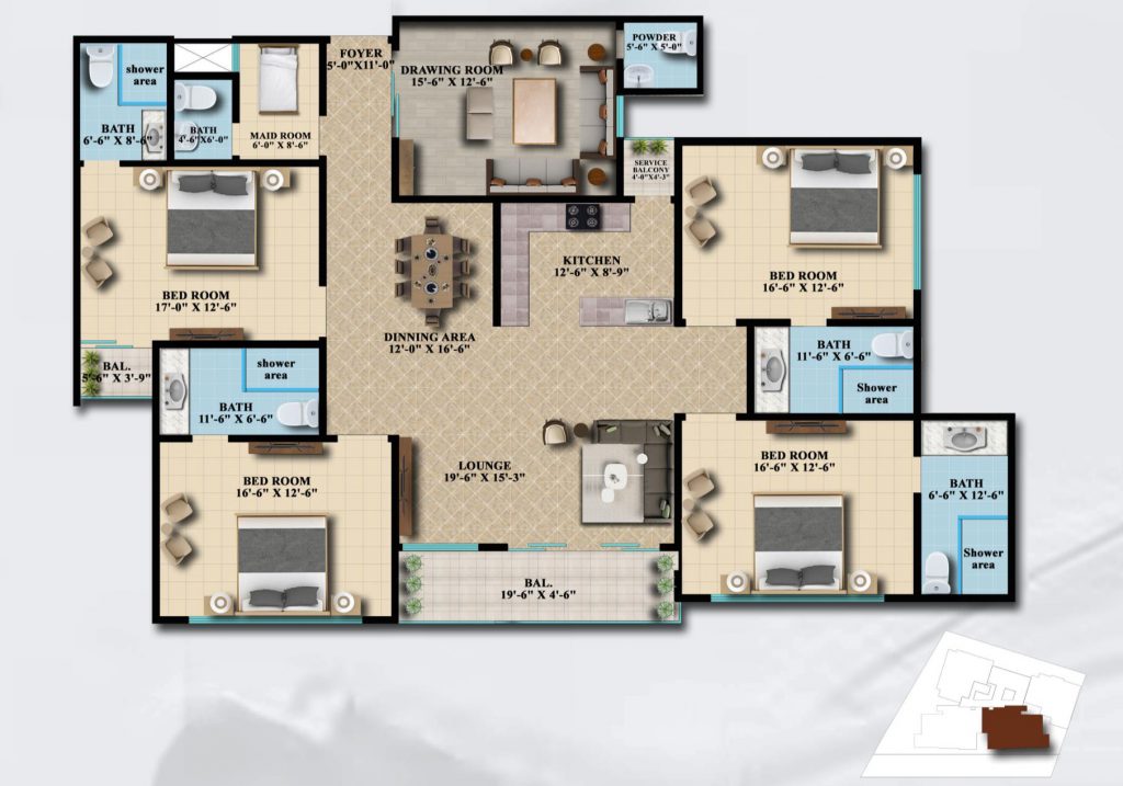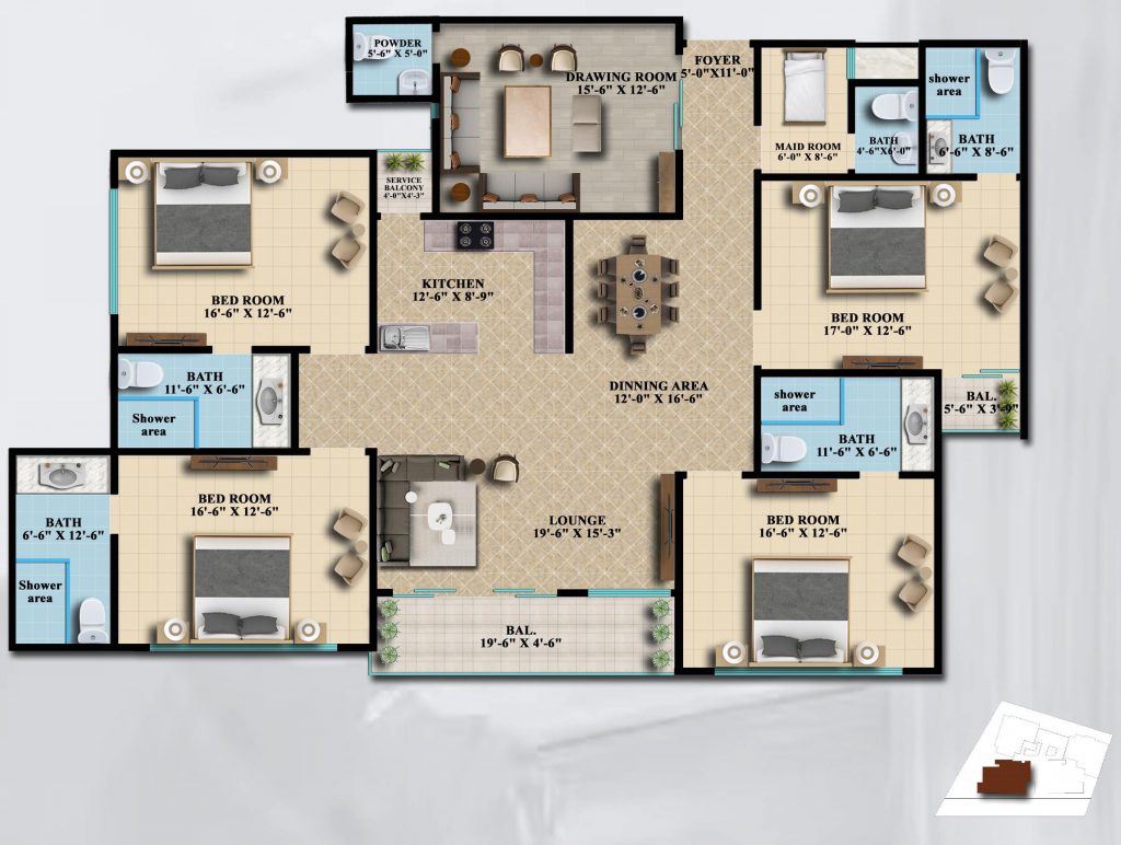 Type AA is a mirror image of a Type A apartment. Intuitively designed on an area of 2627.50 square feet, the 6-room apartment offers 1 master bedroom with attached washroom and balcony, 3 other bedrooms with an attached bathroom, a maid room with an attached washroom, a drawing room with attached powder room, American style open kitchen with a service balcony and a spacious lounge.
